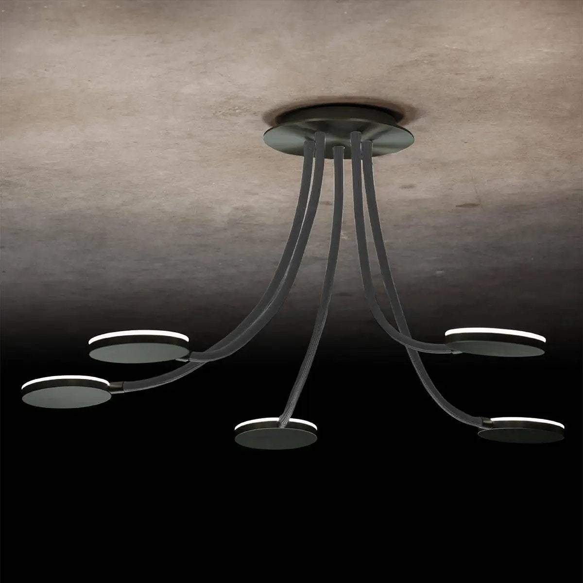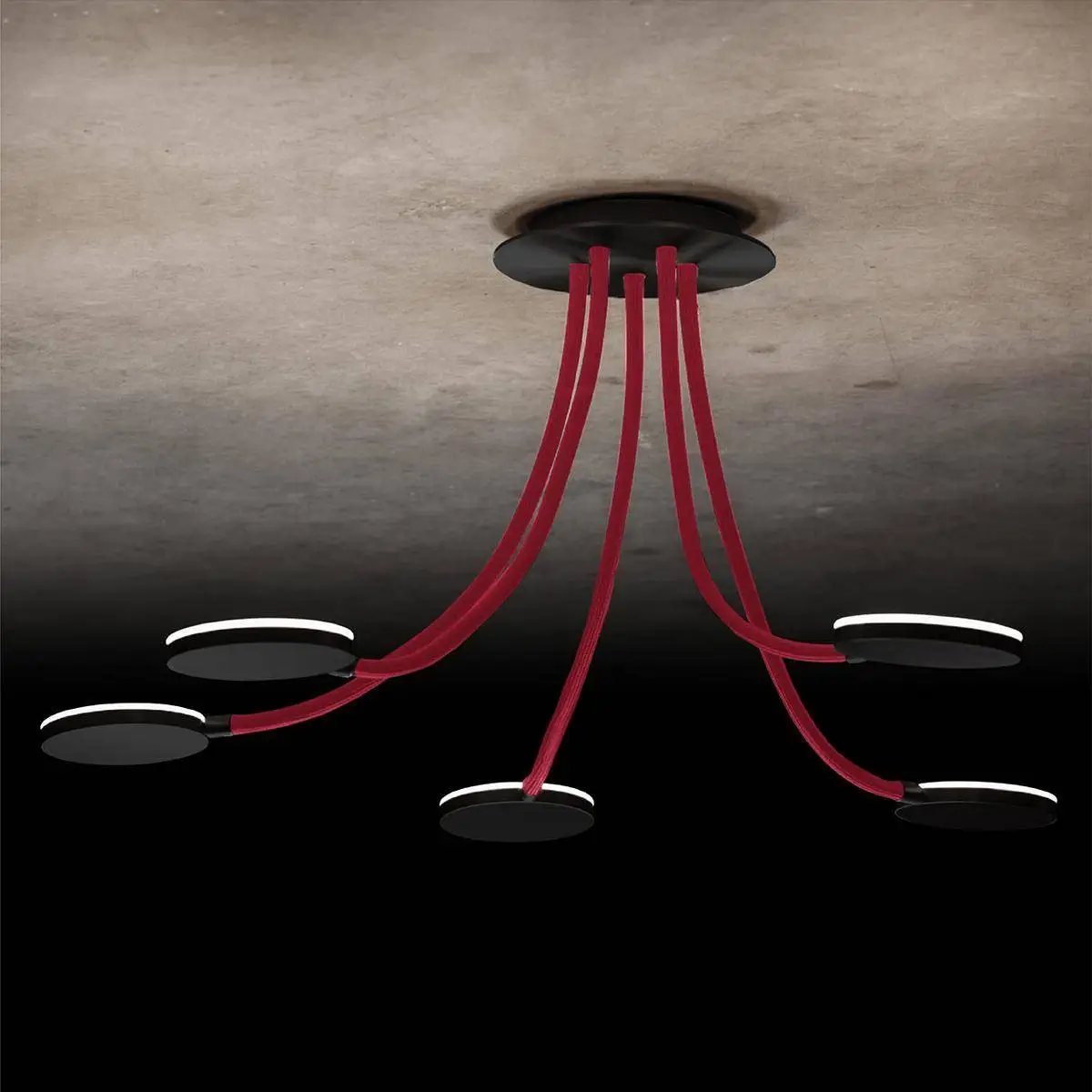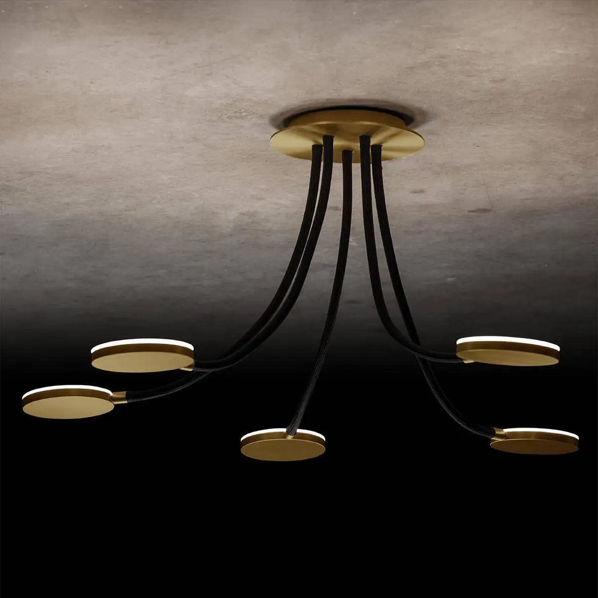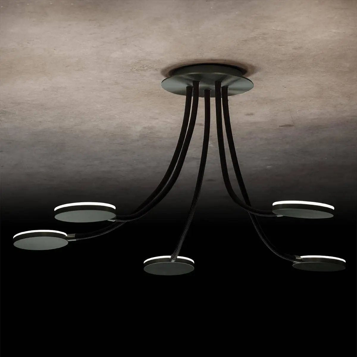 Flex D5 - Die ausgefallene LED-Deckenleuchte. Eine leichte Montage, mit Hilfe des magnetischen Baldachins, individuell einstellbare Flex-Schläuche und schwenkbare Reflektoren, all das bringt die Deckenleuchte Flex mit sich! Die Leuchten sind stufenlos dimmbar über einen Phasenabschnittsdimmer. Maße Baldachin: 200mm, Arme: 600 mm; Oberflächen: messing, schwarz, platin, aluminium; Flex-Schlauch-Farben: sand, rot, blau, grau, schwarz; Farbtemperatur: 2700 Kelvin; Lieferung erfolgt: inkl. fest verbautem LED-Leuchtmittel. Art.-Nr.: L-221147