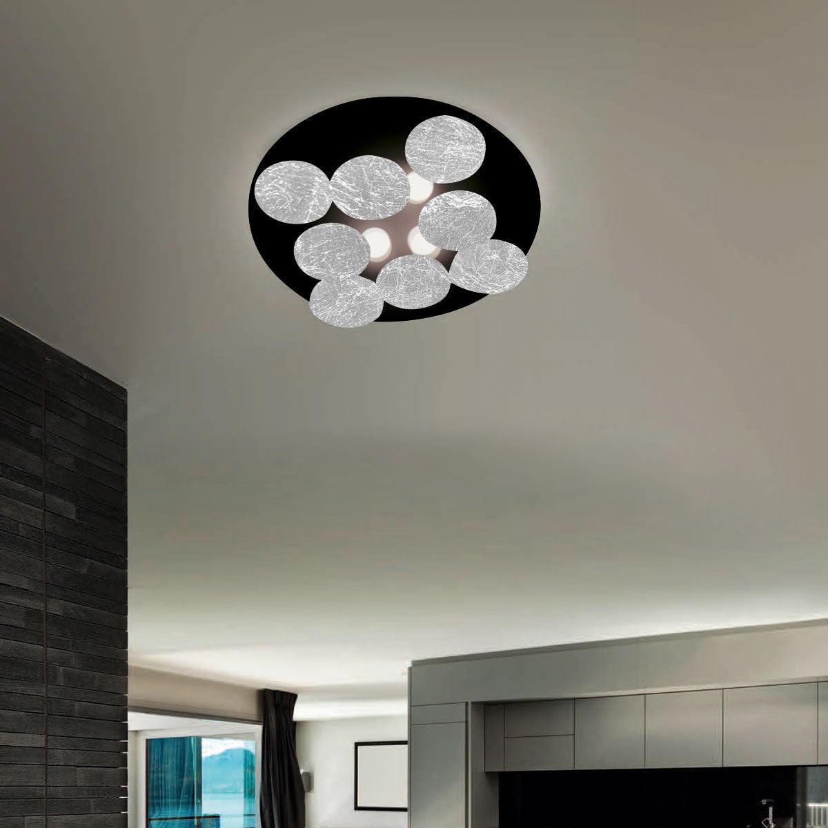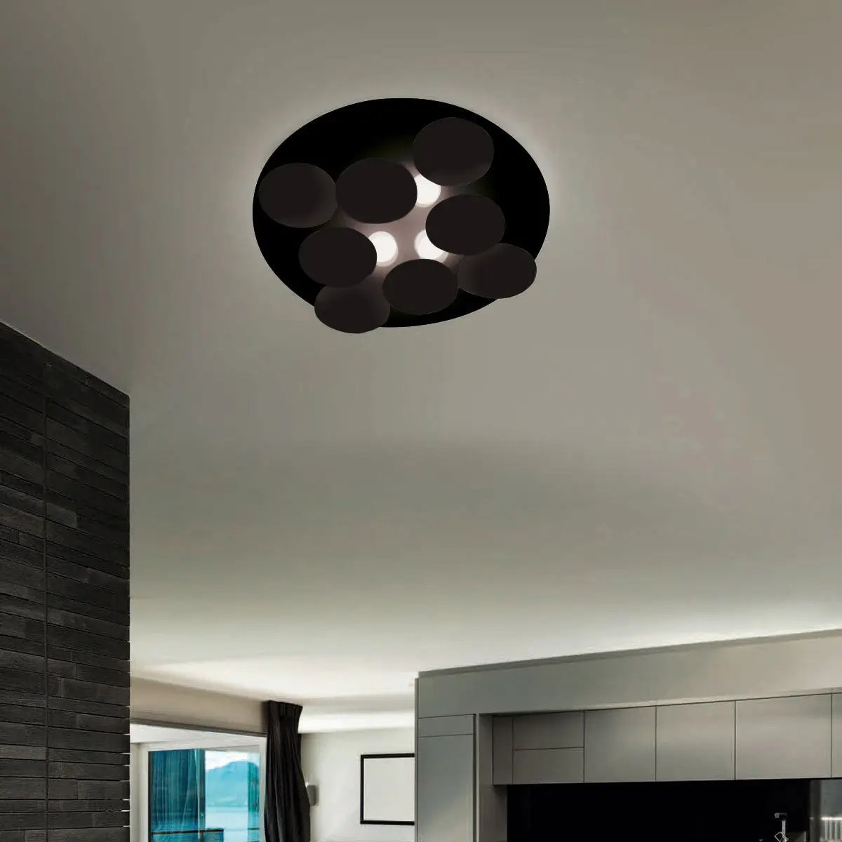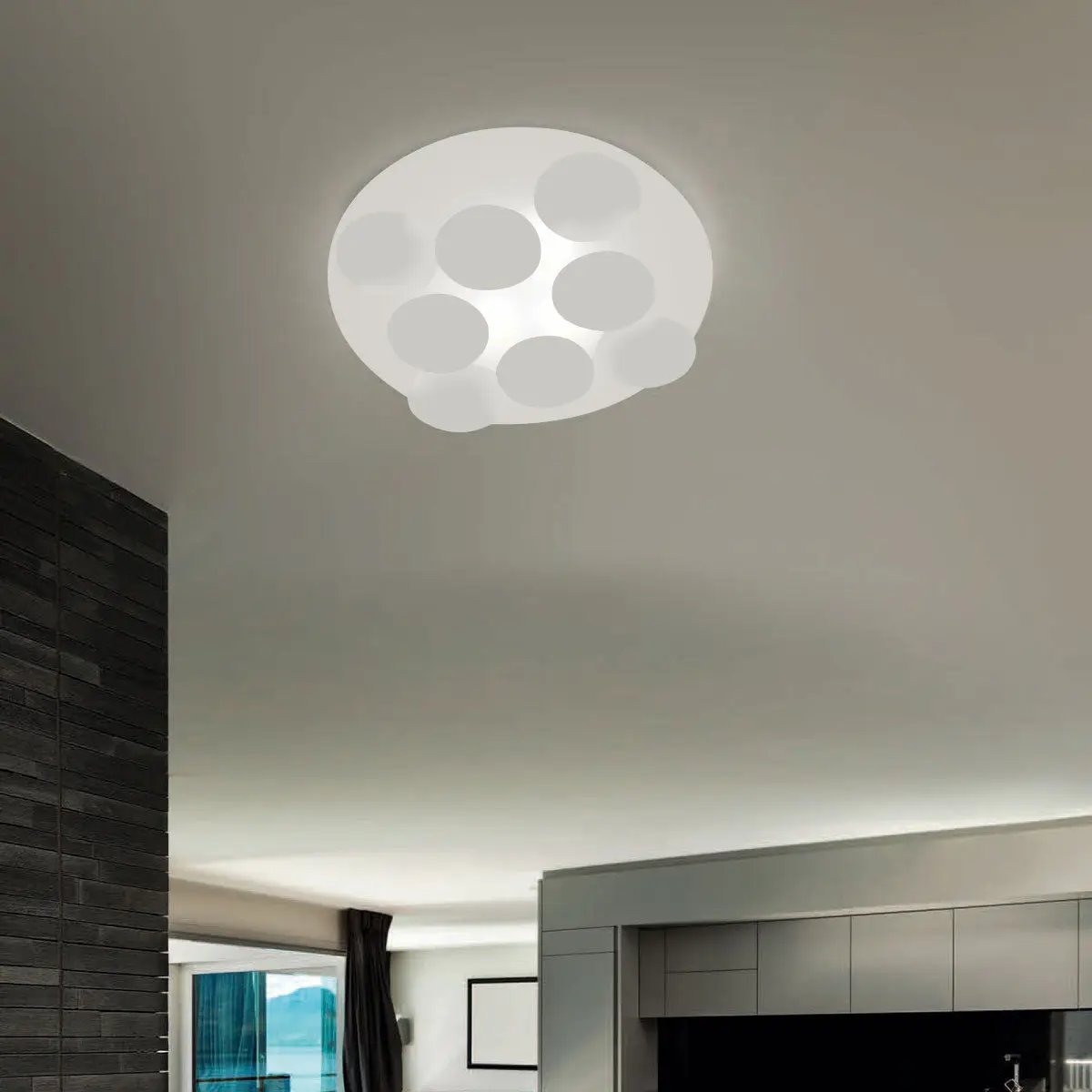 Die Deckenleuchte Nuvola von Braga besticht durch ihre weiche, harmonische Formgebung und futuristisch-minimalistische Linienführung. Acht runde Elemente unter dem Baldachin dienen nicht nur als beeindruckende Designelemente, sondern werfen auch einen Teil des Lichts nach oben zurück. Dies schafft eine wundervolle Mischung aus direktem und indirektem Licht, die angenehm hell und entspannend wirkt. Nuvola ist in den verschiedensten Farben erhältlich und somit eine exklusive Wahl für jeden Raum.