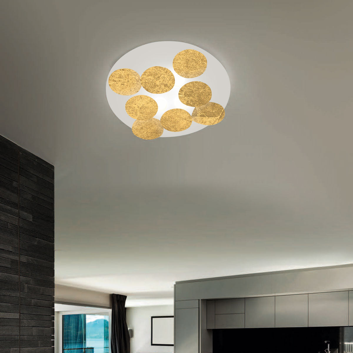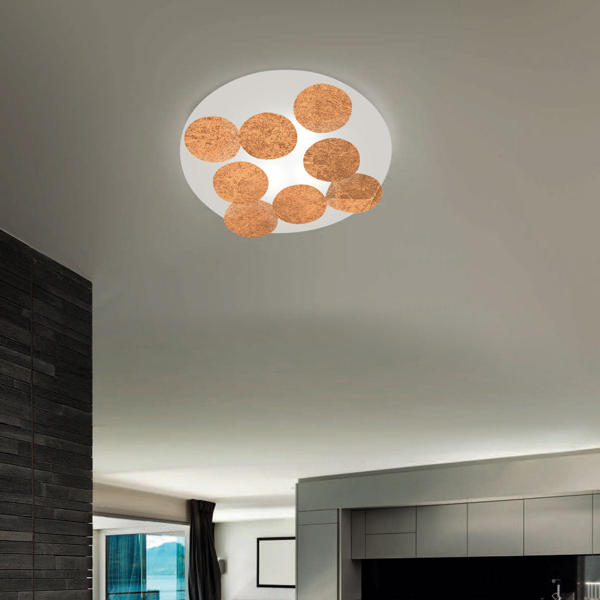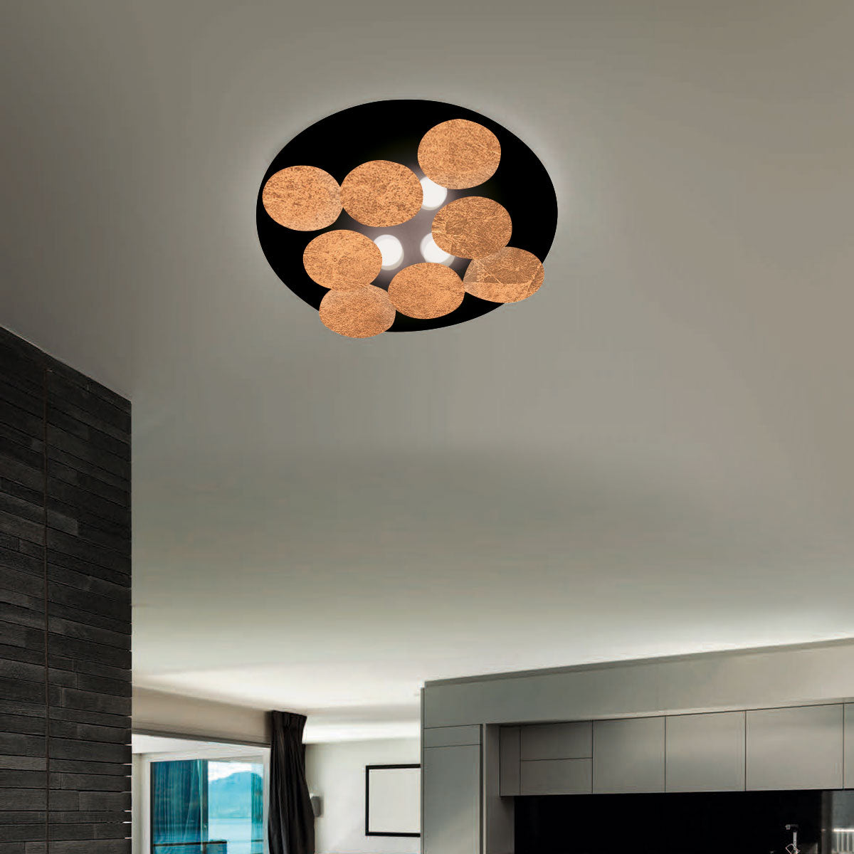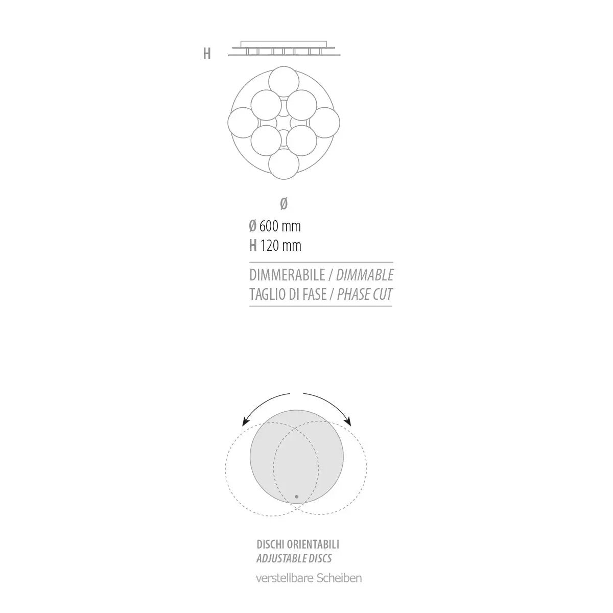 Farben: Außenfarbe: weiß, schwarz; Innenfarbe: weiß, dunkles rost, taupe, blattgold, blattsilber, blattkupfer; Höhe: 12cm; Durchmesser: 60cm; Farbtemperatur: 2700 Kelvin; 40 Watt; 4000 Lumen; Energieeffizienzklasse: G