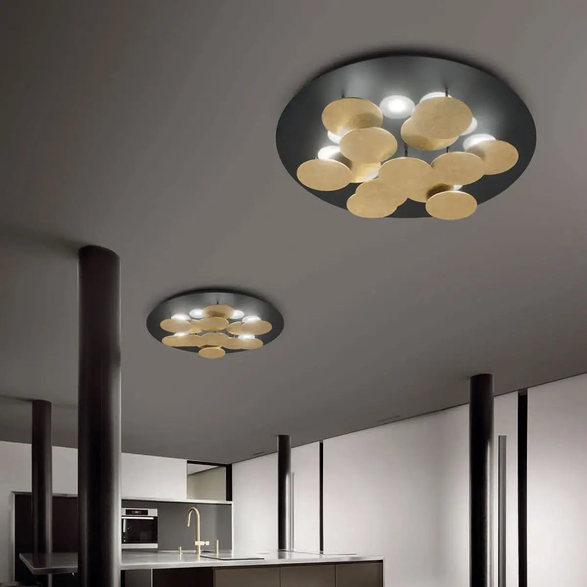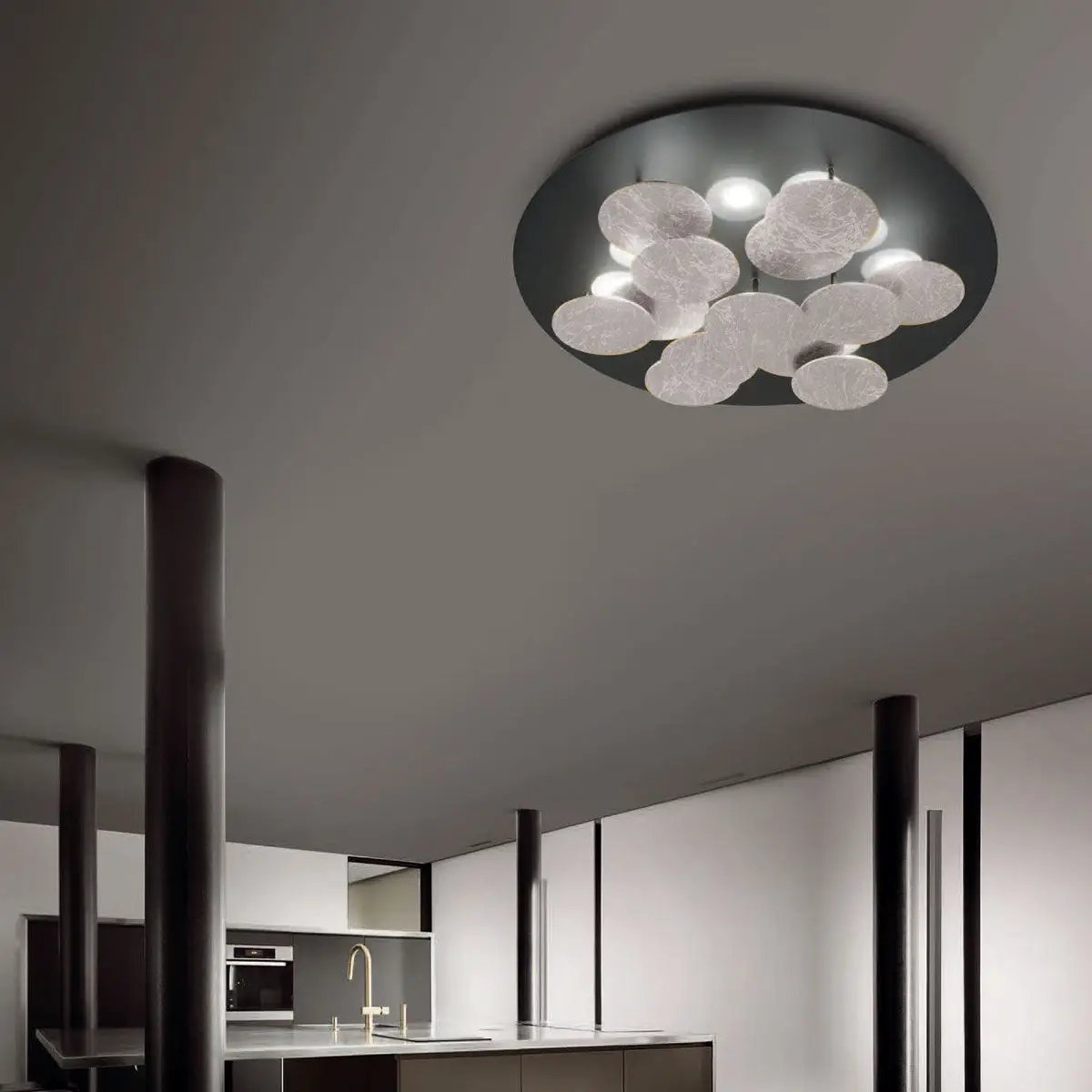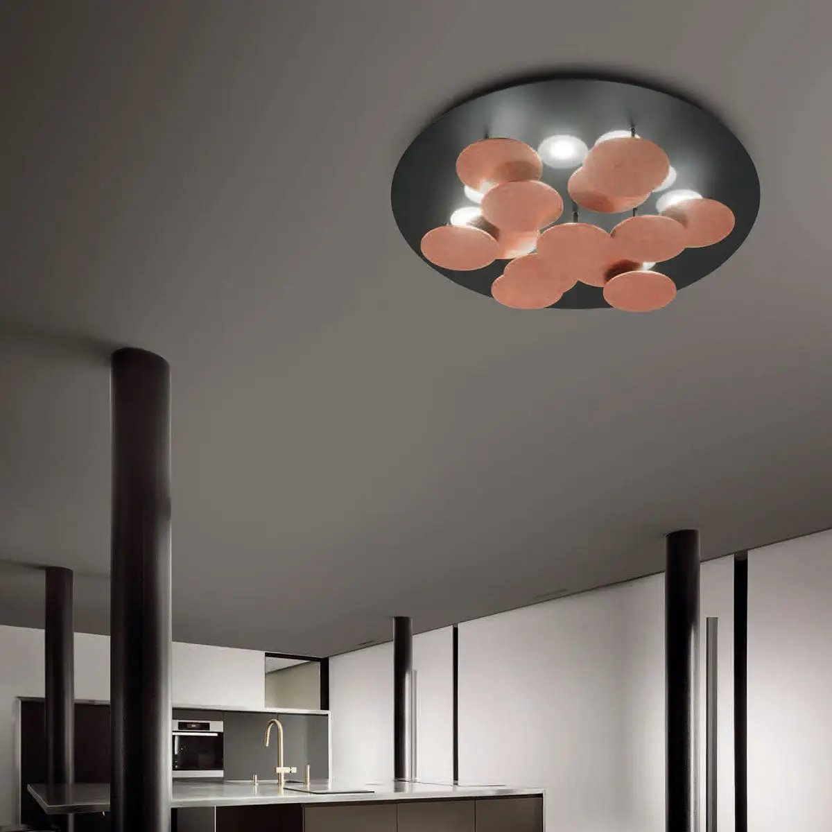 Die Deckenleuchte Nuvola von Braga besticht durch ihre weiche, harmonische Formgebung und futuristisch-minimalistische Linienführung. Dreizehn runde Elemente unter dem Baldachin dienen nicht nur als beeindruckende Designelemente, sondern werfen auch einen Teil des Lichts nach oben zurück. Dies schafft eine wundervolle Mischung aus direktem und indirektem Licht, die angenehm hell und entspannend wirkt. Nuvola ist in den verschiedensten Farben erhältlich und somit eine exklusive Wahl für jeden Raum.