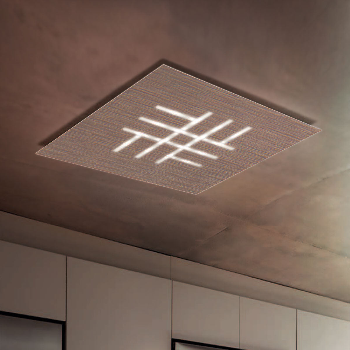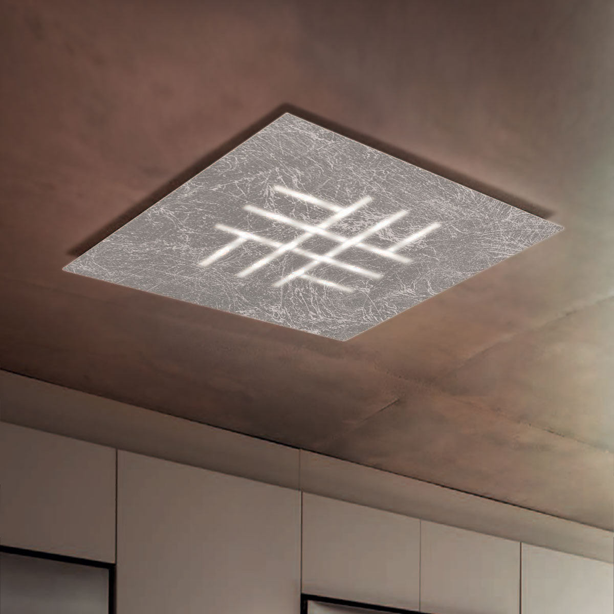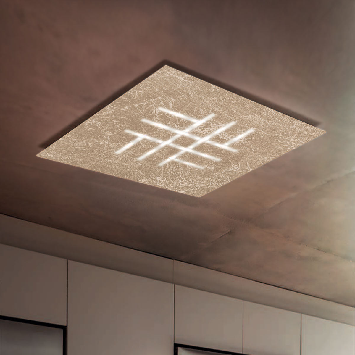 Erhältlich in den verschiedensten Farben. Oberfläche: weiß, schwarz, dunkles rost, taupe, blattsilber, blattgold, oxidiert, dunkelgrau, rosé gebürstet, bronze gebürstet, gold gebürstet, chrom, edelstahl ; Größe: 60x60cm, 35 Watt, 3000 Lumen; Farbtemperatur: 2700 Kelvin; dimmbar: ja, Phasendimmung; Energieeffizienzklasse: G