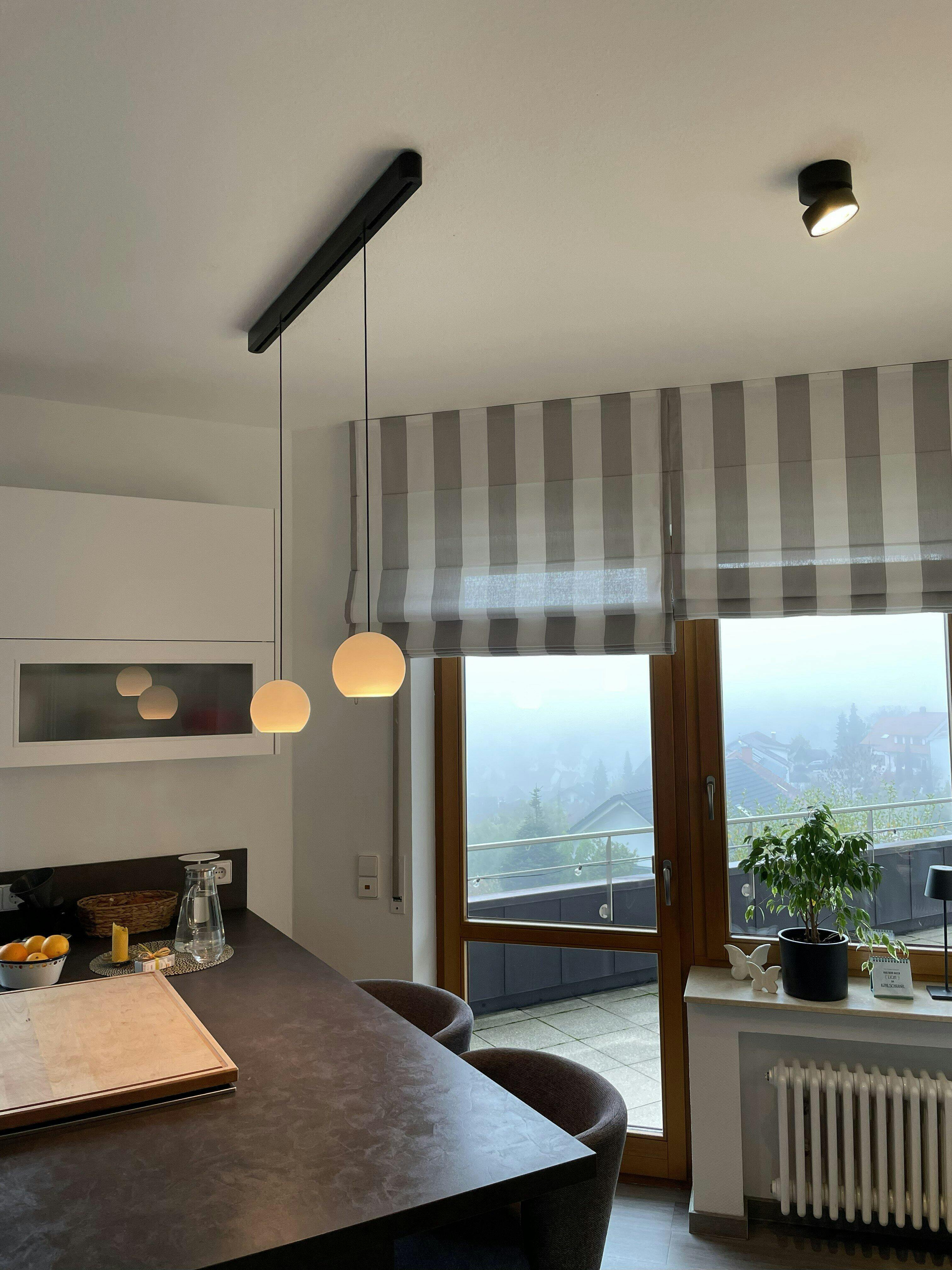 Gestalten Sie Ihre KOS Quattro individuell: Wählen Sie Glasgröße, Kabelfarbe, Schienenoberfläche und Anordnung der Pendelleuchten. Die Pendel lassen sich flexibel in der Schiene verschieben. Kabellänge: 150cm. Verkürzung oder Verlängerung gegen Aufpreis möglich.