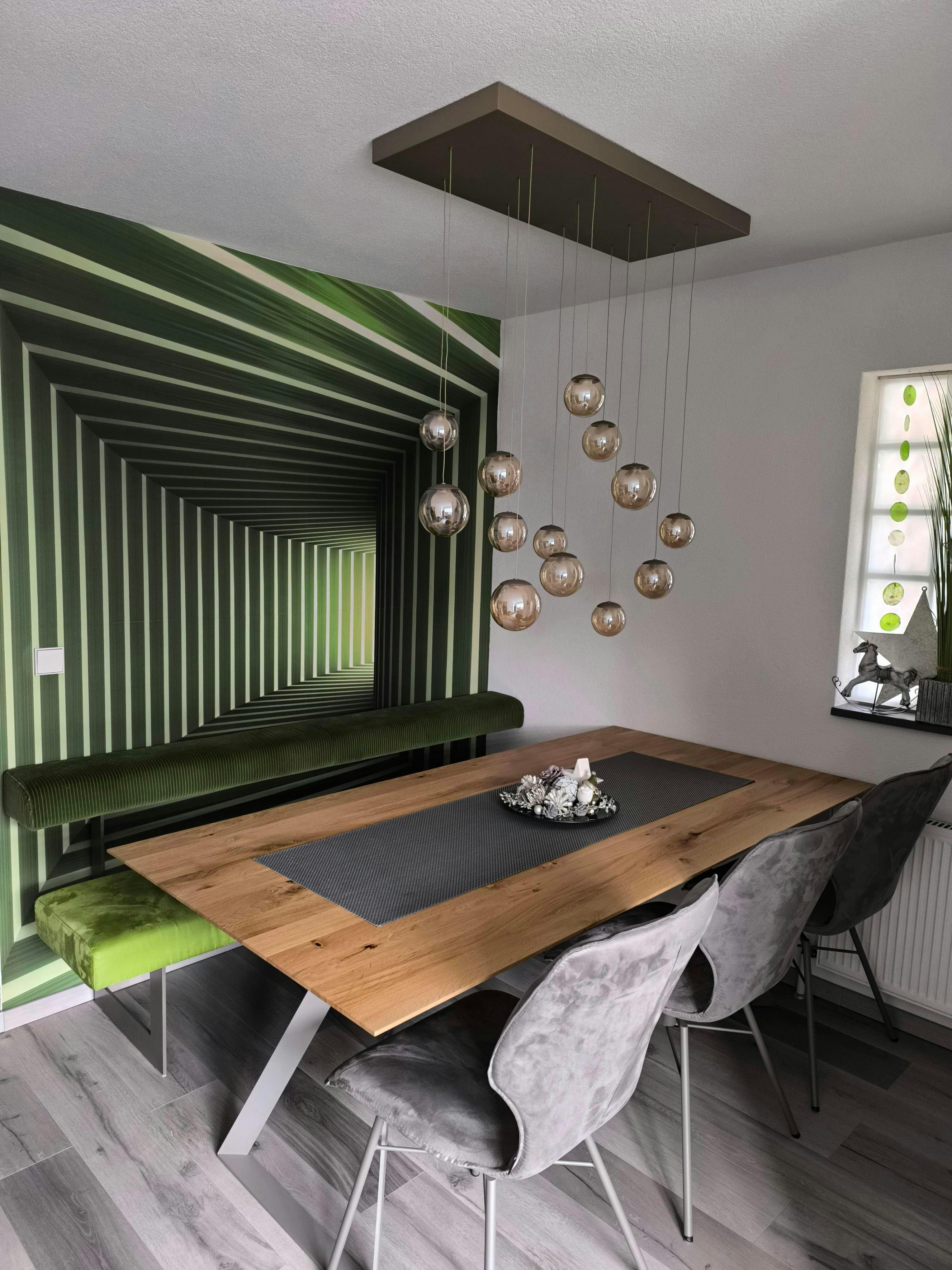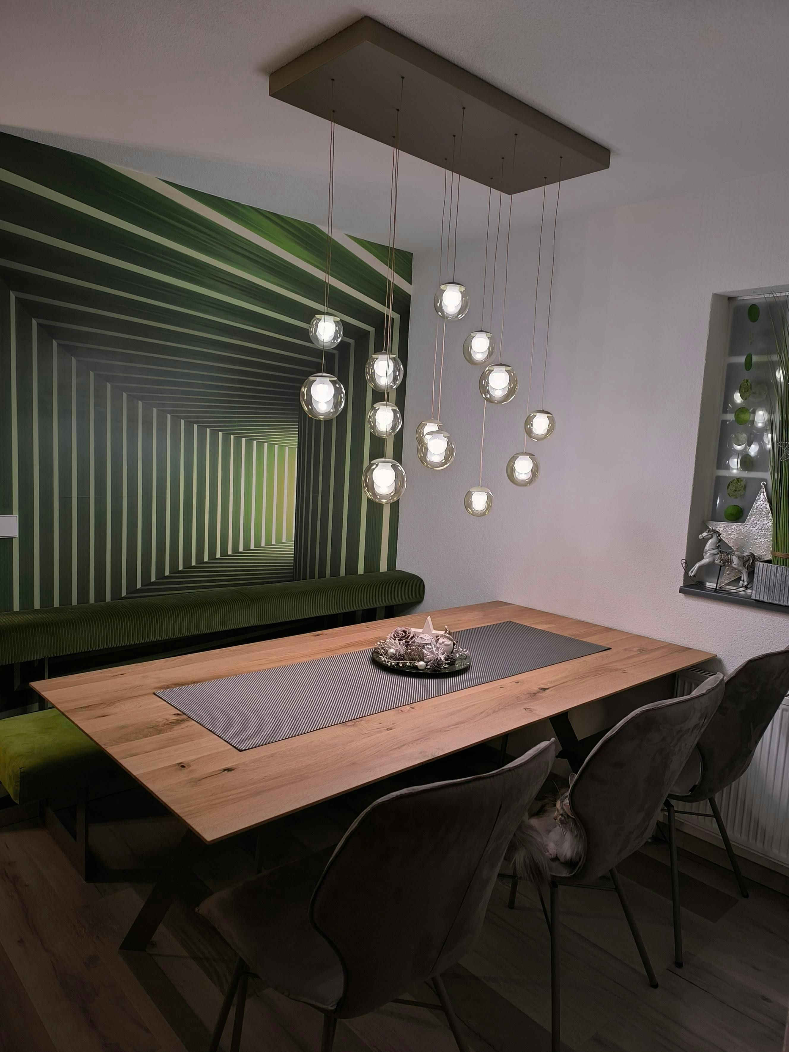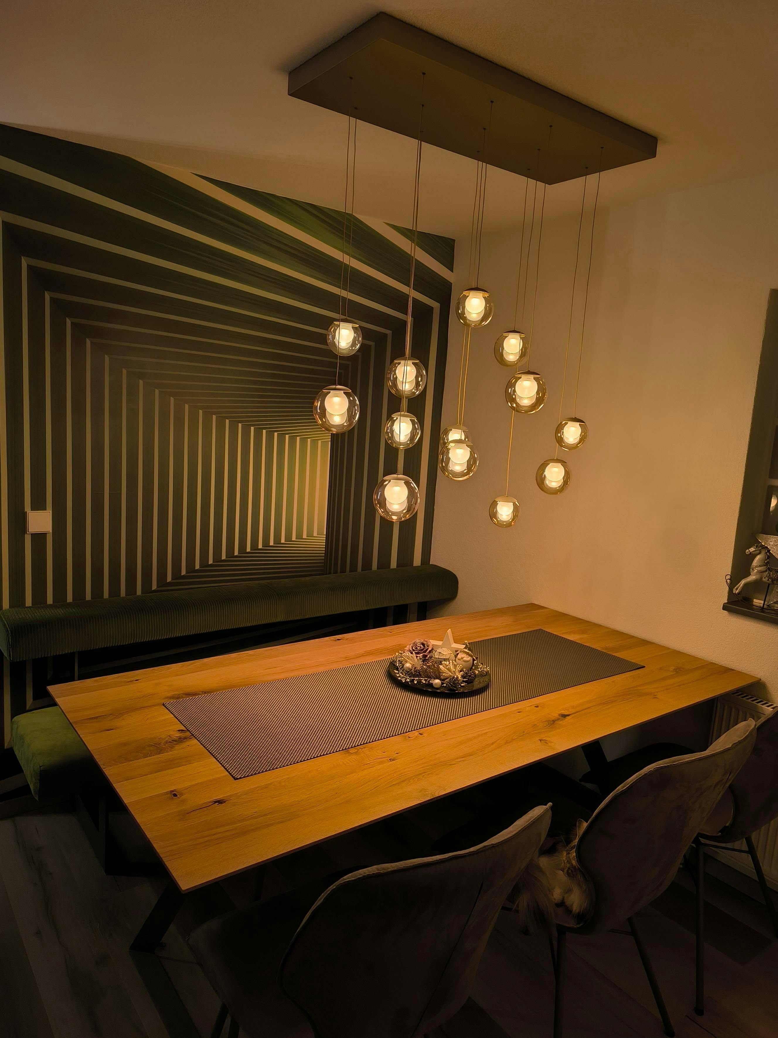 Die Pendelleuchte Popup ist ein echtes Highlight für jedes Zuhause. Ihr edles Designm und die schwebend wirkenden Glaskugeln verleihen jedem Raum eine moderne, zugleich warme Atmosphäre. Das Licht scheint sanft und gleichmäßig – perfekt, um Esstisch, Wohnbereich oder Küche stilvoll in Szene zu setzen. Mit ihrer eleganten Form und dem hochwertigen Finish wird diese Leuchte zum Blickfang, der Design und Gemütlichkeit harmonisch vereint. Ein Statement für alle, die modernes Licht mit zeitloser Eleganz lieben.