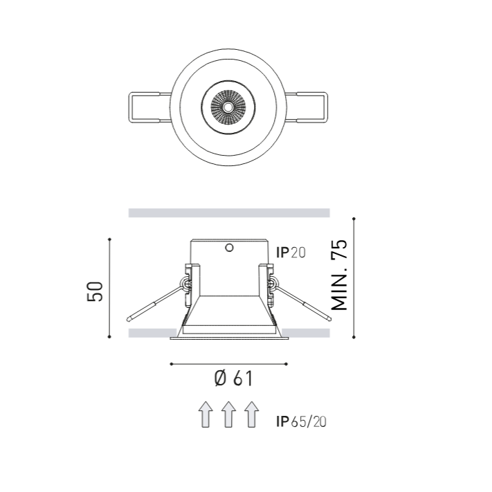 Durchmesser: 61mm, Höhe: 50mm, Einbautiefe: mind. 75mm, Deckenausschnitt: 55mm, Dimmbar: ja, über Phasendimmung / DALI, Lieferung erfolgt: inkl. fest verbautem Betriebsgerät