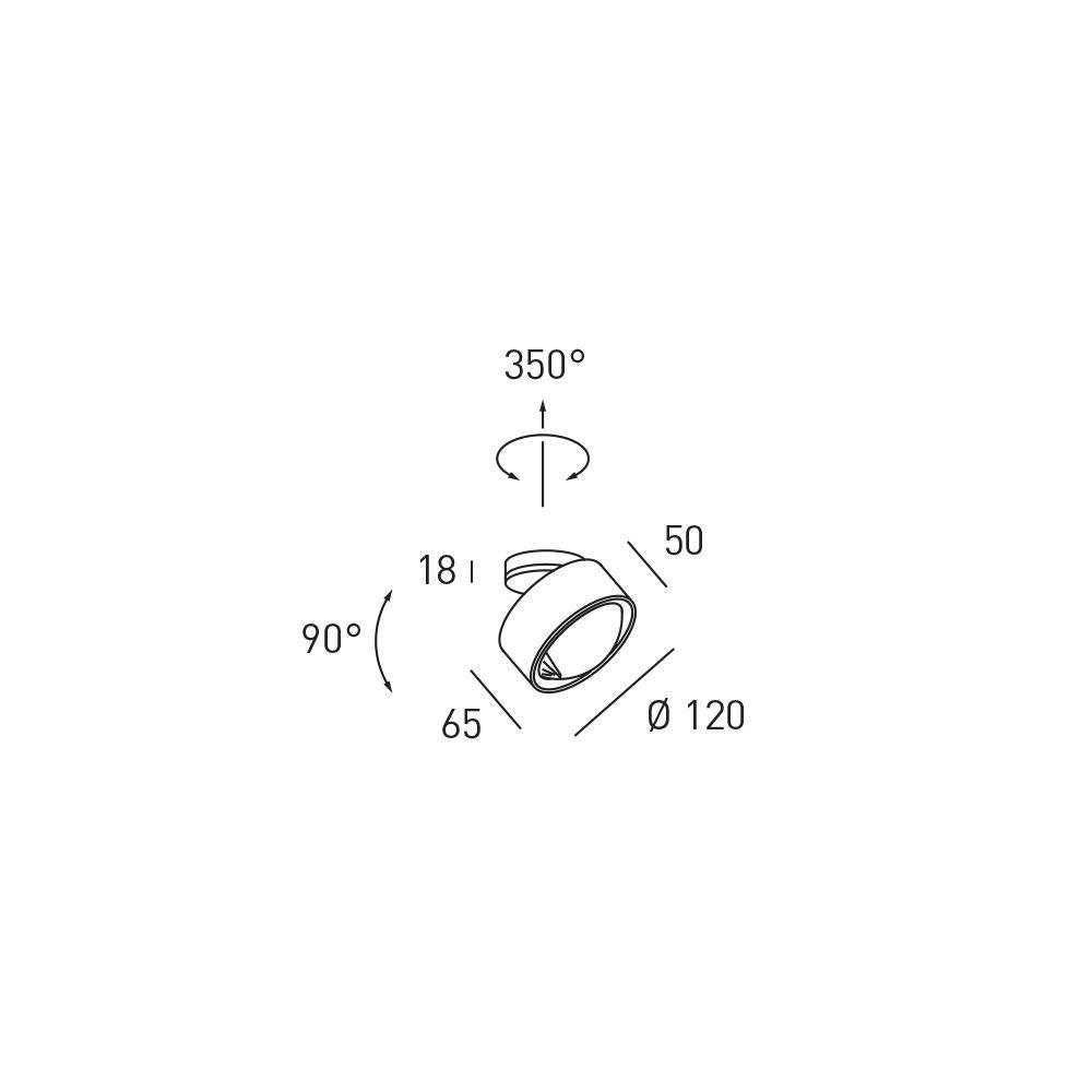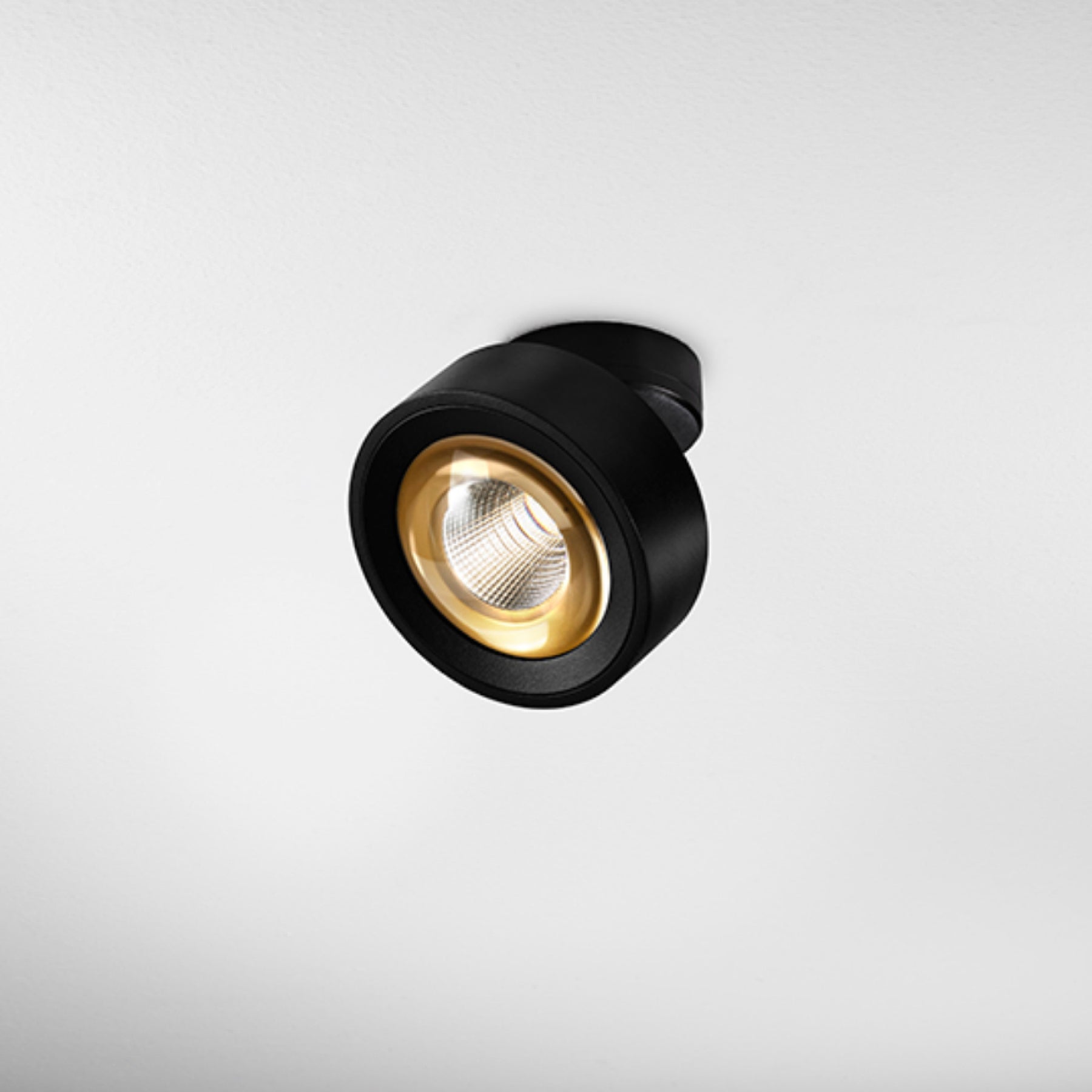 The Clippo Optic surface-mounted spotlight optimally illuminates the room: Thanks to the rotating and swiveling lamp head, the direction of the light can be varied. With its integrated lens, this light creates a unique beam pattern. This spotlight is available in the following finishes: white/white, white/gold, black/black, and black/gold. Lamp head diameter: 12 cm, height: 6.8 cm, beam angle: 35 degrees. Supplied with a permanently installed LED light source.