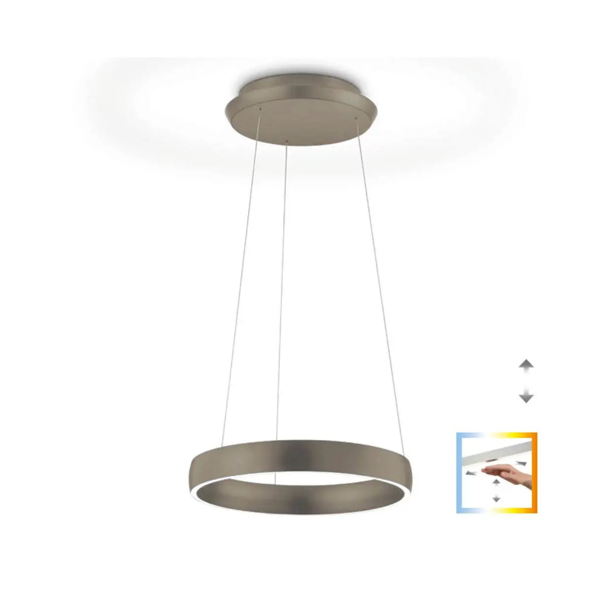 Made in Germany: the Sara pendant light lets every room shine in new splendour. Thanks to the stepless height adjustment in a range of 100 cm, it adapts individually to the needs for light. The upper and lower lights can be switched and dimmed separately via gesture control. The color temperature can also be set via gesture control for optimal light at any time of the day. Delivery includes: LED bulbs (permanently installed, not replaceable).