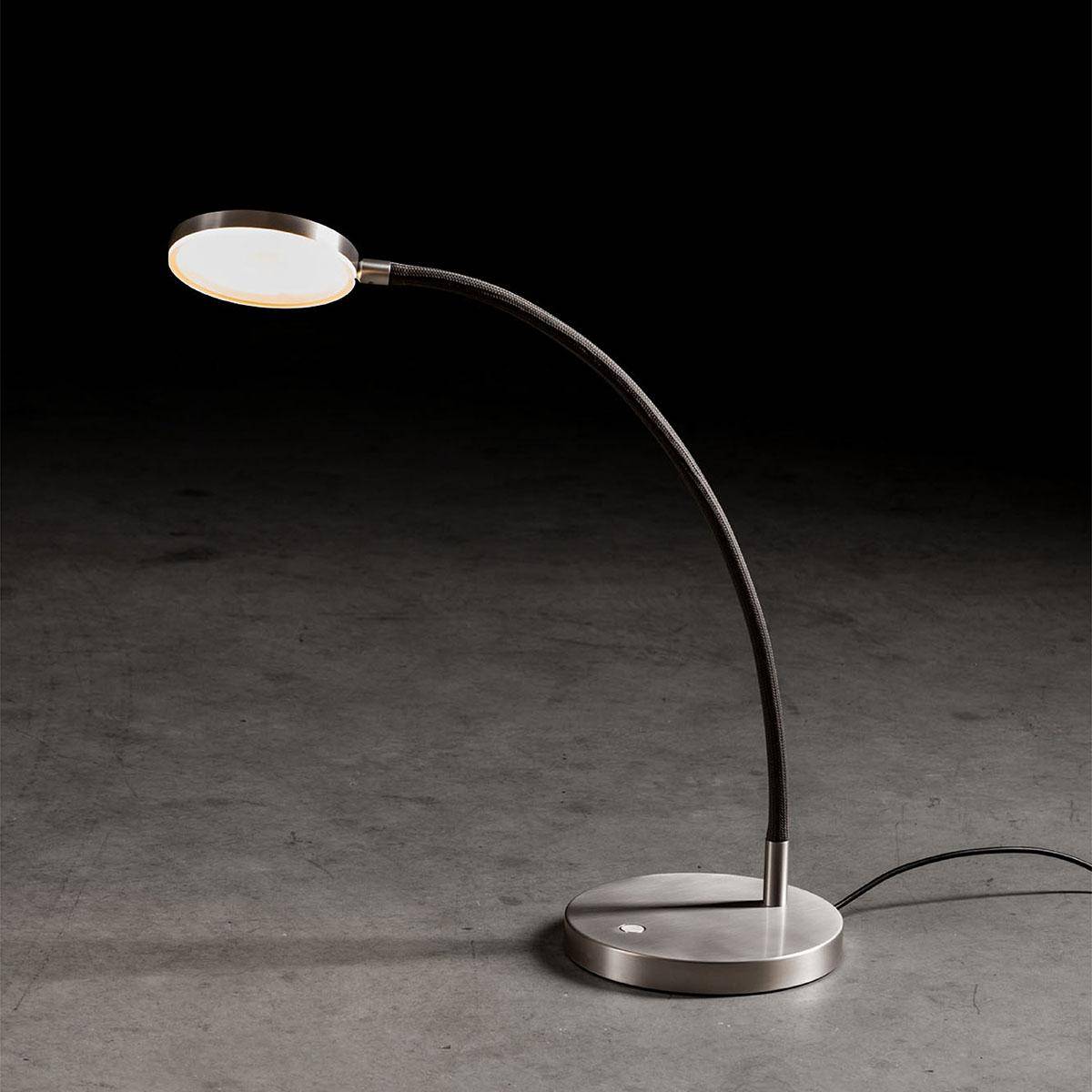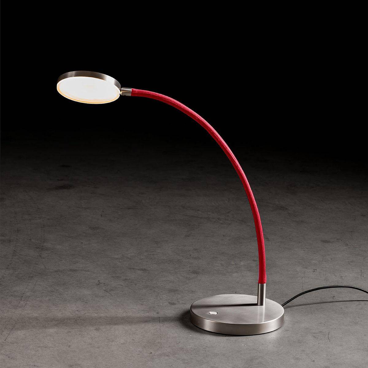 Flex T - The modern lighting solution for every table. The Flex table lamp is available with a clamp (Flex K) and with a base (Flex T) and is therefore the solution for every application. High-quality surfaces meet modern, hard-wearing flex hoses in different colors. Due to the different surfaces and hoses, there are numerous possible combinations, which means that every customer requirement can be met. Both lights are dimmable. The Flex T is set using a touch dimmer in the center of the base. Dimensions base: 180 mm wide, arm: 850 mm; Finishes: brass, black, platinum, aluminium; Flex hose colors: sand, red, blue, gray, black; Color temperature: 2700 Kelvin; Delivery includes: permanently installed LED light source. Item no.: L-221143