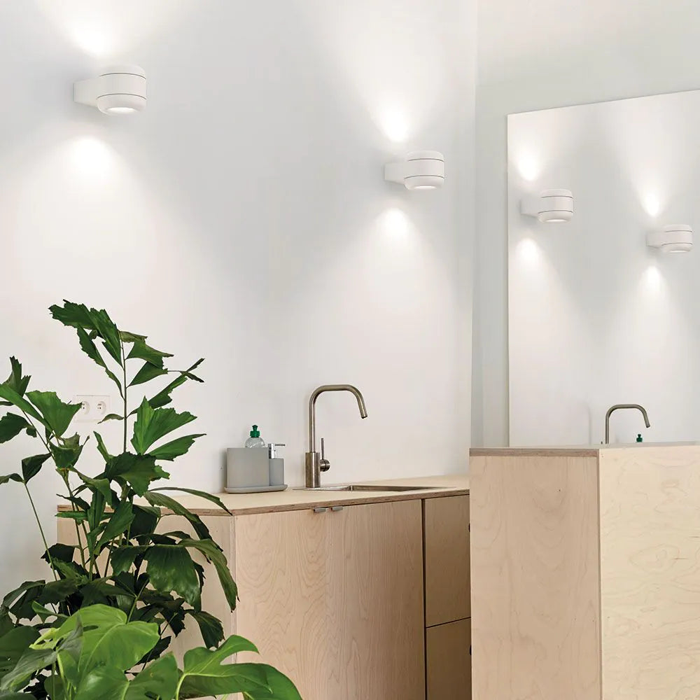 Der geschwungene Aluminiumkörper und das vertieft sitzende Leuchtmittel ermöglichen eine gleichmäßige und kontrollierte Lichtverteilung. Dadurch entfaltet sich das Licht weich an der Wand und sorgt für ein harmonisches Zusammenspiel aus direktem und indirektem Licht. Diese Kombination macht die Leuchte ideal für Waschtischbereiche, Gästebad oder WC.