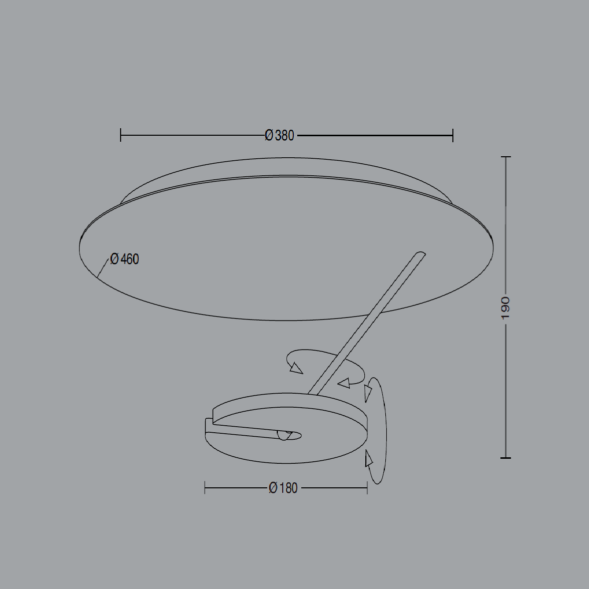 Baldachin: Ø38cm, Platte: Ø46cm, Höhe Gesamt: 19cm, Leuchtkörper: Ø18cm, vollständig dreh-/schwenkbar