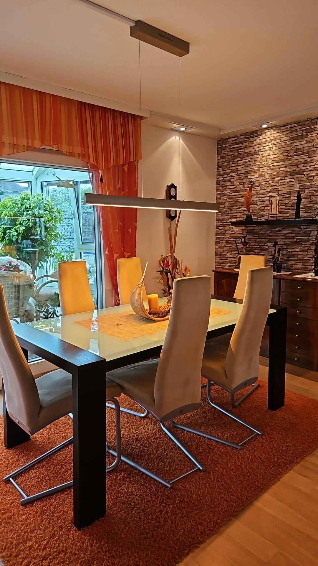 La suspension LED Runa (lumière chaude à tamisée) de Knapstein est réglable en hauteur en continu et disponible en 92 cm, 112 cm, 132 cm et 152 cm. Son réglage en continu permet une adaptation personnalisée aux besoins de chacun. Combinant éclairage direct vers le bas et indirect vers le haut, elle offre une lumière d'ambiance chaleureuse idéale pour un dîner convivial. L'éclairage direct et indirect peut être commandé et modulé indépendamment par gestes, et la température de couleur est réglable de 2200 à 3000 K. Runa dispose d'une fonction mémoire : elle conserve le dernier réglage utilisé lors de sa prochaine utilisation. Remarque : Aucun variateur supplémentaire ne doit être installé avec cette lampe, car son intensité lumineuse est réglable par commande gestuelle.