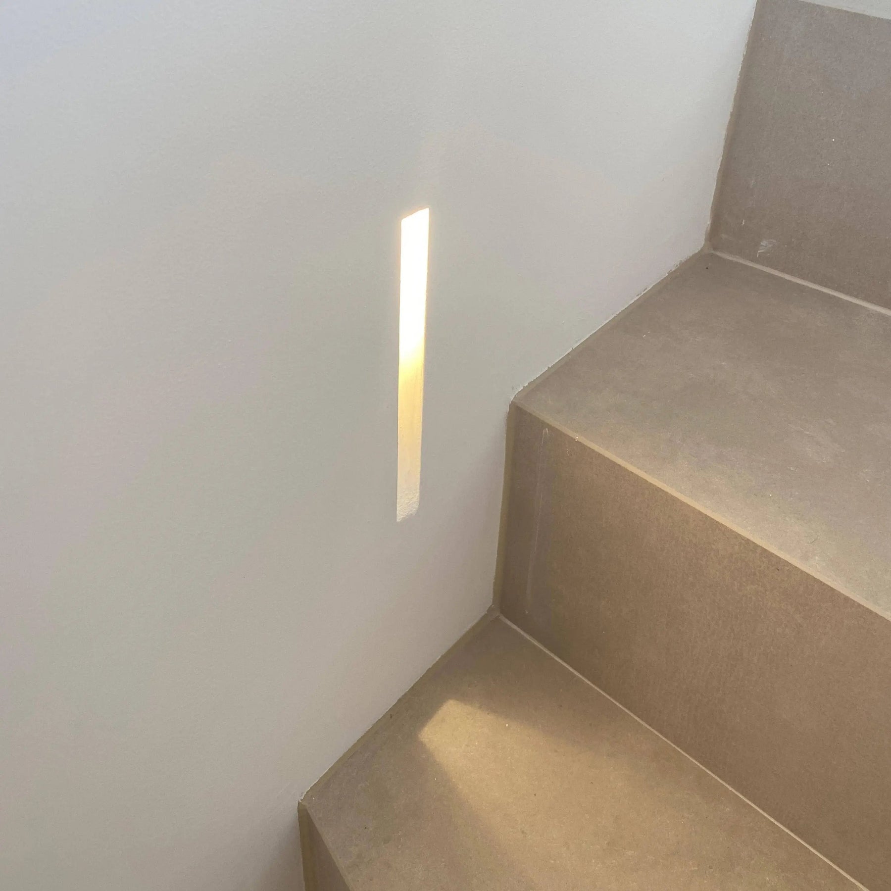 Applique murale encastrée allongée Strip de Brick in the Wall : Longueur : 24,5 cm, Largeur : 7,8 cm, Profondeur : 7,1 cm, Profondeur d’encastrement : env. 8 cm, Dimensions minimales de découpe : 25 x 8,5 x 8,5 cm, Couleur de la surface : Enduit blanc à peindre, Source lumineuse : LED 2 W, Couleur de la lumière : 2 700 K (blanc extra chaud), Flux lumineux : env. 200 lumens, IRC > 90 %, Courant : 350 mA. ATTENTION : Un transformateur externe est indispensable pour ce luminaire (en cas de doute, n’hésitez pas à nous contacter !). Projection de la lumière : Asymétrique, Intensité variable : Selon le transformateur, Installation : Doit être réalisée en collaboration avec un électricien et un plâtrier. Fournie avec une source lumineuse LED intégrée (non remplaçable).