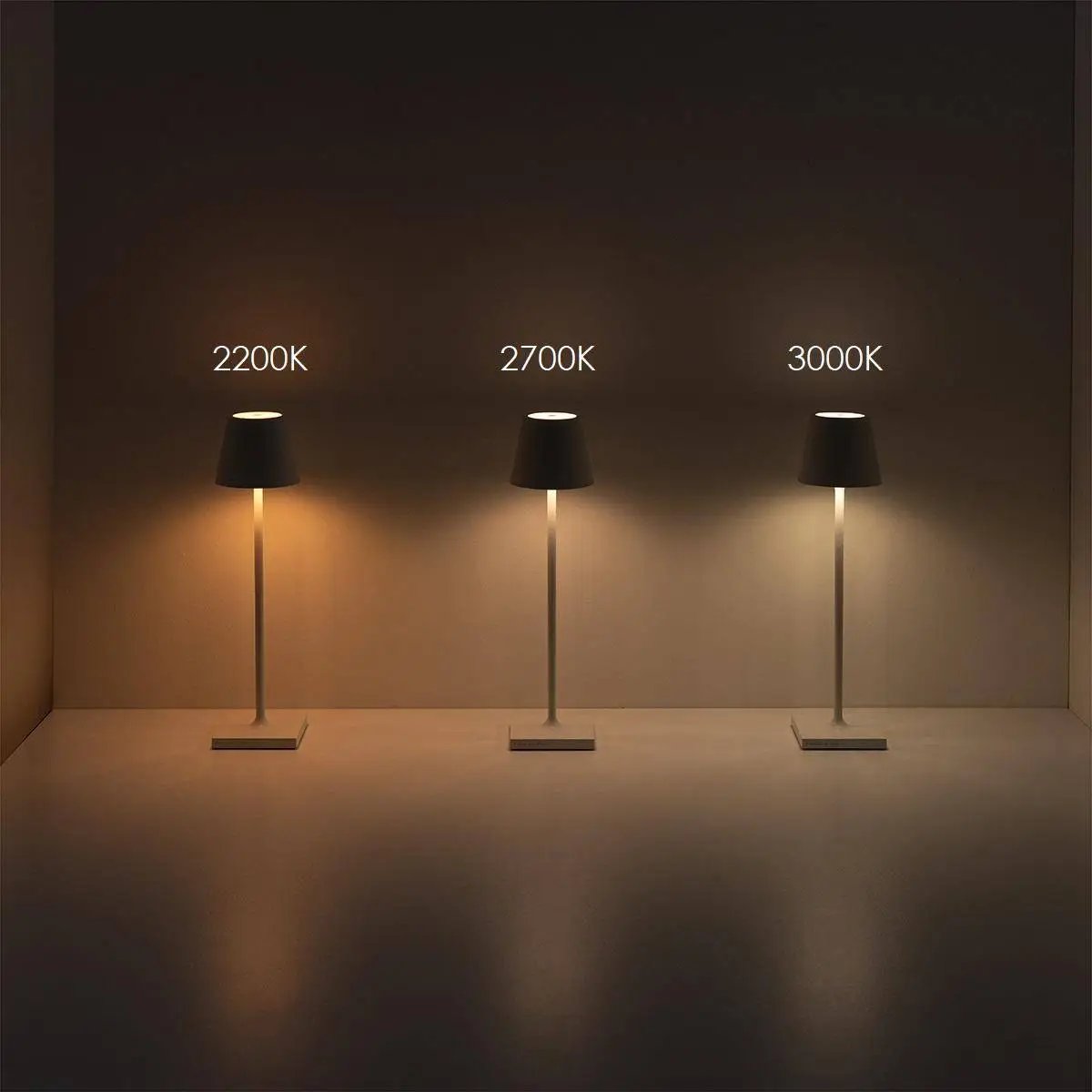 Leistung: 2,2W, Lumen: 234 - 251 - 256 Lumen, Farbtemperatur: einstellbar 2200-2700-3000Kelvin, Länge: 11cm, Breite: 11cm, Höhe: 30cm, Dimmbar: ja, stufenlos per Touch, CRI>80