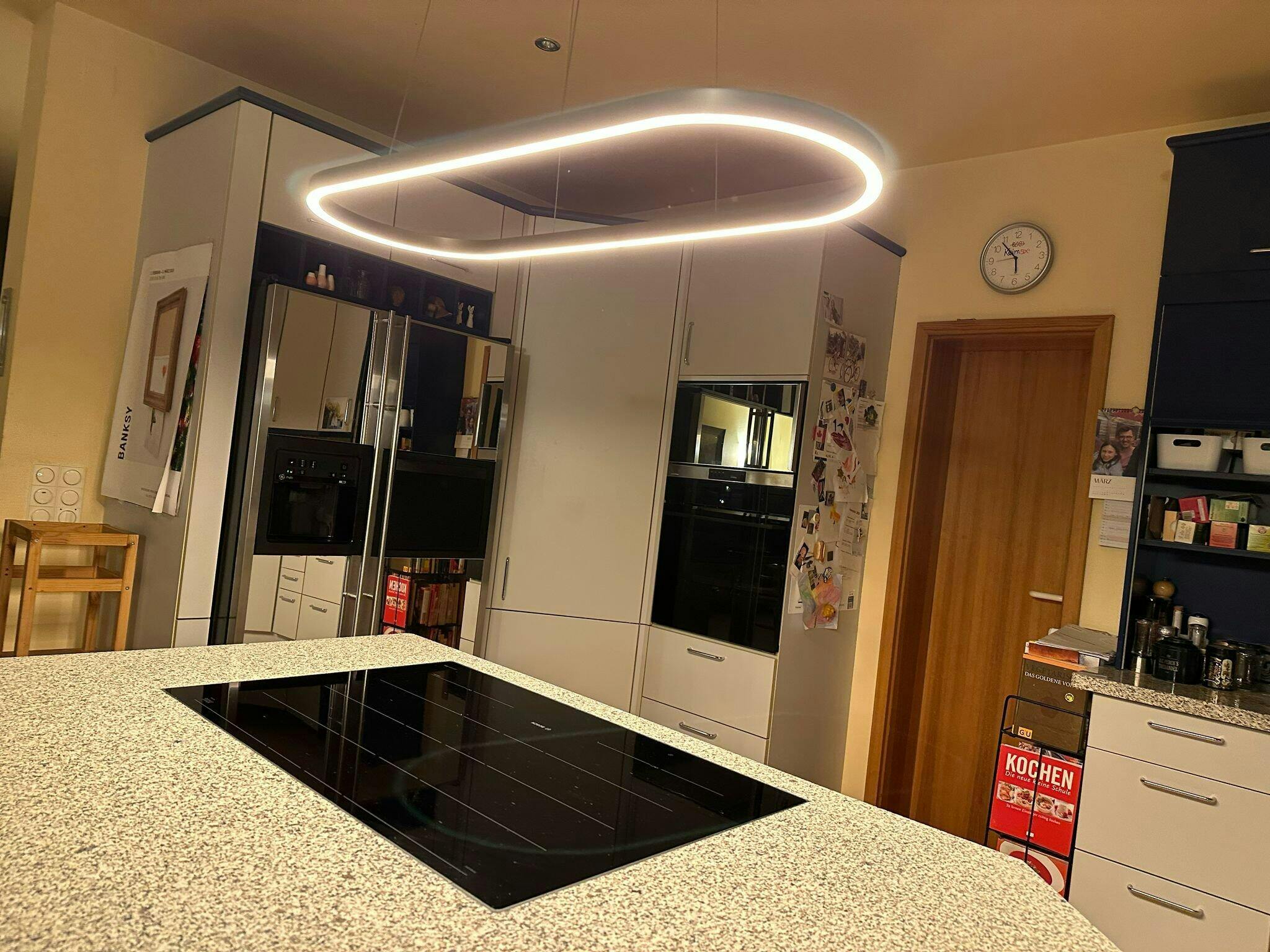 Leistung: 111W, Lumen: 13.300, Farbtemperatur: 2200-3000K, Dimmbar: ja durch Gestensteuerung, Höhenverstellbar in einem Bereich von ca. 100cm, Ovale Form mit Länge: 95cm, Breite: 35cm.